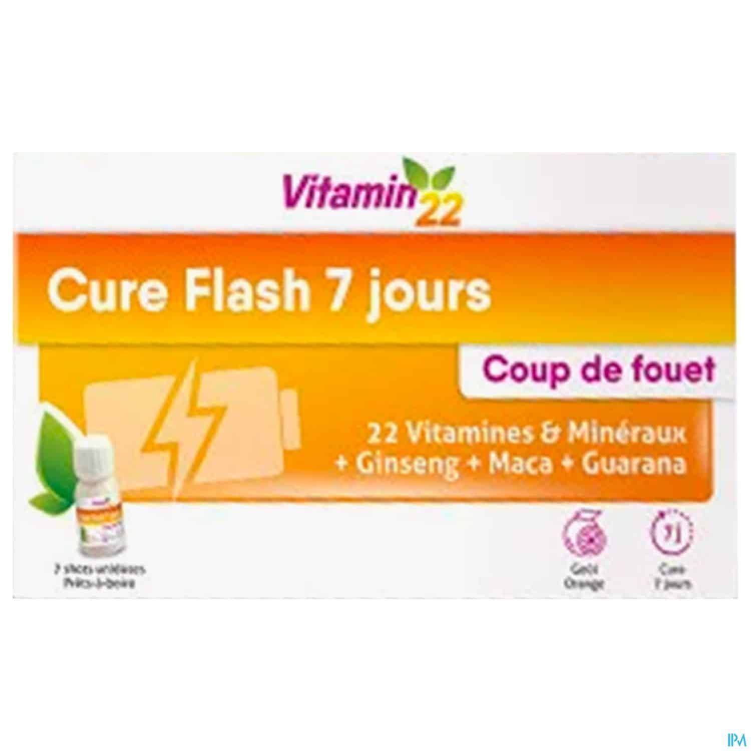 VITAMIN' 22 CURE FLASH 7 JOURS a été spécialement formulé à base de Vitamines, Minéraux et extraits de plantes, pour l'énergie et la vitalité quotidienne de l'organisme. Un véritable coup de fouet pour bien démarrer la journée !