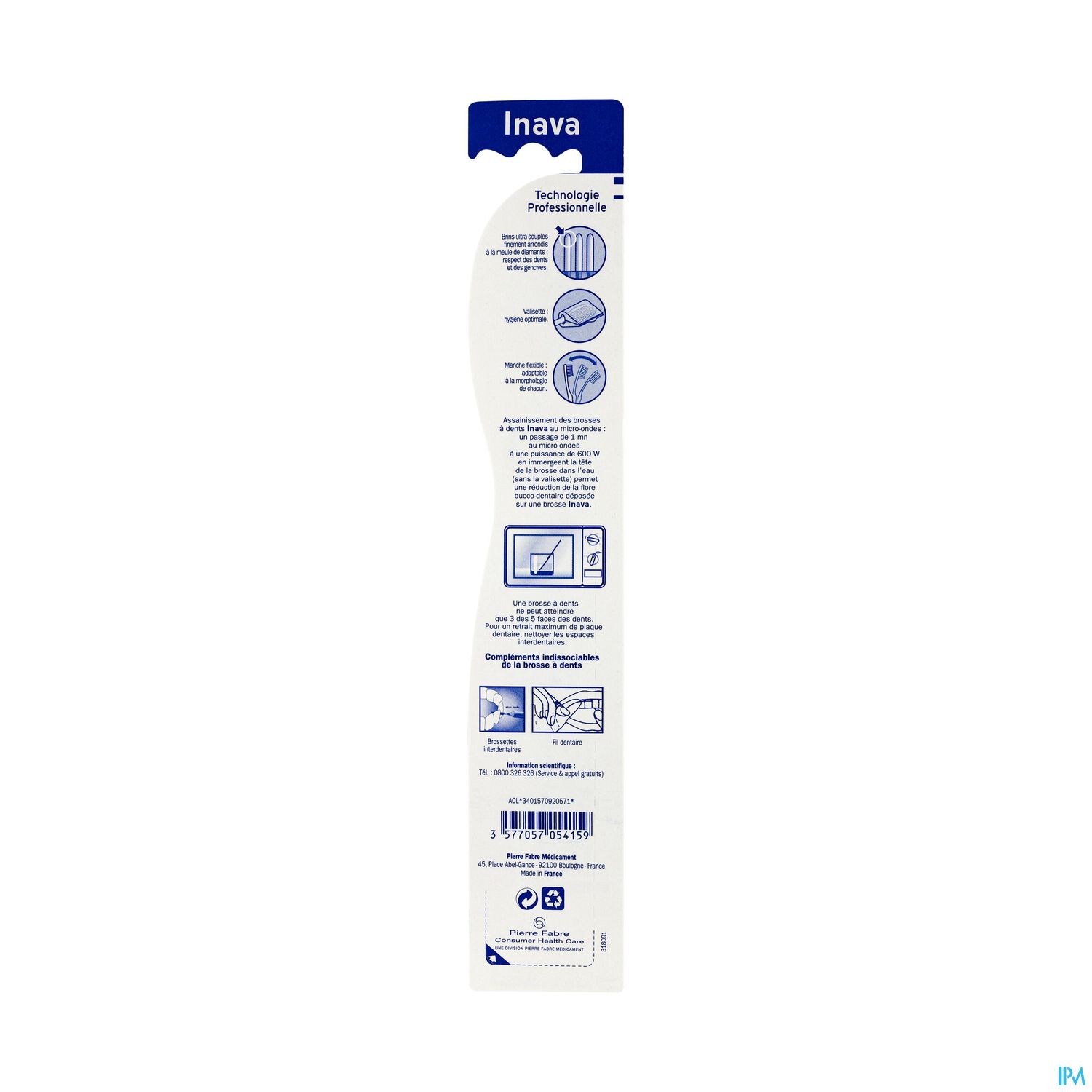Inava Parodontie, brosse à dents adaptée à un retour progressif au brossage normal, s'utilise à partir de la 4e semaine (22e jour) post-chirurgicale, en relais de la brosse à dents Inava Chirurgicale Extra-Souple 15/100. Sa coupe en V inversé et ses brins en nylon de qualité 15/100 finement arrondis pénètrent les espaces interdentaires et les zones difficiles d'accès et permettent une excellente hygiène bucco-dentaire. Assainissable, elle se place au micro-ondes (1 minute à 600 W en présence d'eau) pour éliminer 99,9 % des bactéries.*